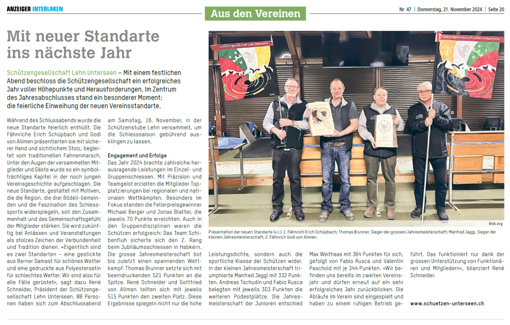 Die Schützengesellschaft Lehn Unterseen kann auf ein erfolgreiches Schiessjahr zurückblicken. Die Gruppen Bockstor und Steinbock sowie die Jugendschützen haben starke Resultate abgeliefert.